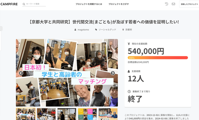 京都大学との共同研究プロジェクトは、『まごとも』を通じた世代間交流が若者に与える価値を明らかにすることを目的としています。今回のクラウドファンディングでは、研究に必要な資金を集めることができました。この研究は、高齢者との交流を通じて学生の自己肯定感が向上するかどうかに焦点を当て、今後の社会的課題解決に向けた新たな知見を提供することを期待しています。