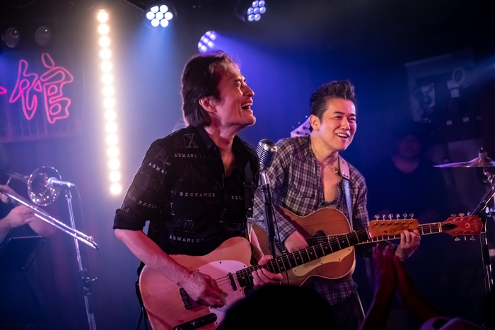 アンコール。盛大な拍手で迎えられたのは、MAGIC後期メンバーによる『あの夏が聴こえてくる』をプロデュースした織田哲郎だ。颯爽とテレキャスターを構え、この日のために買ったという、アーミング奏法を足元で操るビグスビー・ペダルを踏む。嬉々としてギターを弾きまくる姿は、日本を代表するスーパープロデューサーというよりは、一人のギターキッズだ。織田の作曲した「パステルカラーに染めてくれ」「あの夏が聴こえてくる」を歌いながら、弾きながら、アイコンタクトを交わし合う、そこにはきっと二人だけにわかる何かがある。さらに近藤房之助&織田哲郎による1992年のヒット曲「BOMBER GIRL」は、織田がリードボーカルを取って上澤津が息の合ったハーモニーをつける。残すはあと1曲。