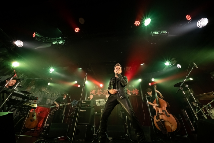 いかした革ジャン、リーゼント、銀のバックルにエンジニアブーツ。「行くぞ!」と一声吼えると、ガイコツマイクをひっつかみ、1曲目「ロカビリーカーニバル」からぶっ飛ばす上澤津。フロアを埋めたオーディエンスに笑いかけ、拳を振り上げ、「東京バーニングタウン」「傷だらけのパラダイス」とアップテンポのMAGICナンバーを畳みかける。ホーン隊を含む7人のバンドメンバーは凄腕揃いで、疾走感とスウィング感を兼ね備えたご機嫌なサウンドで後ろからガンガン煽る。