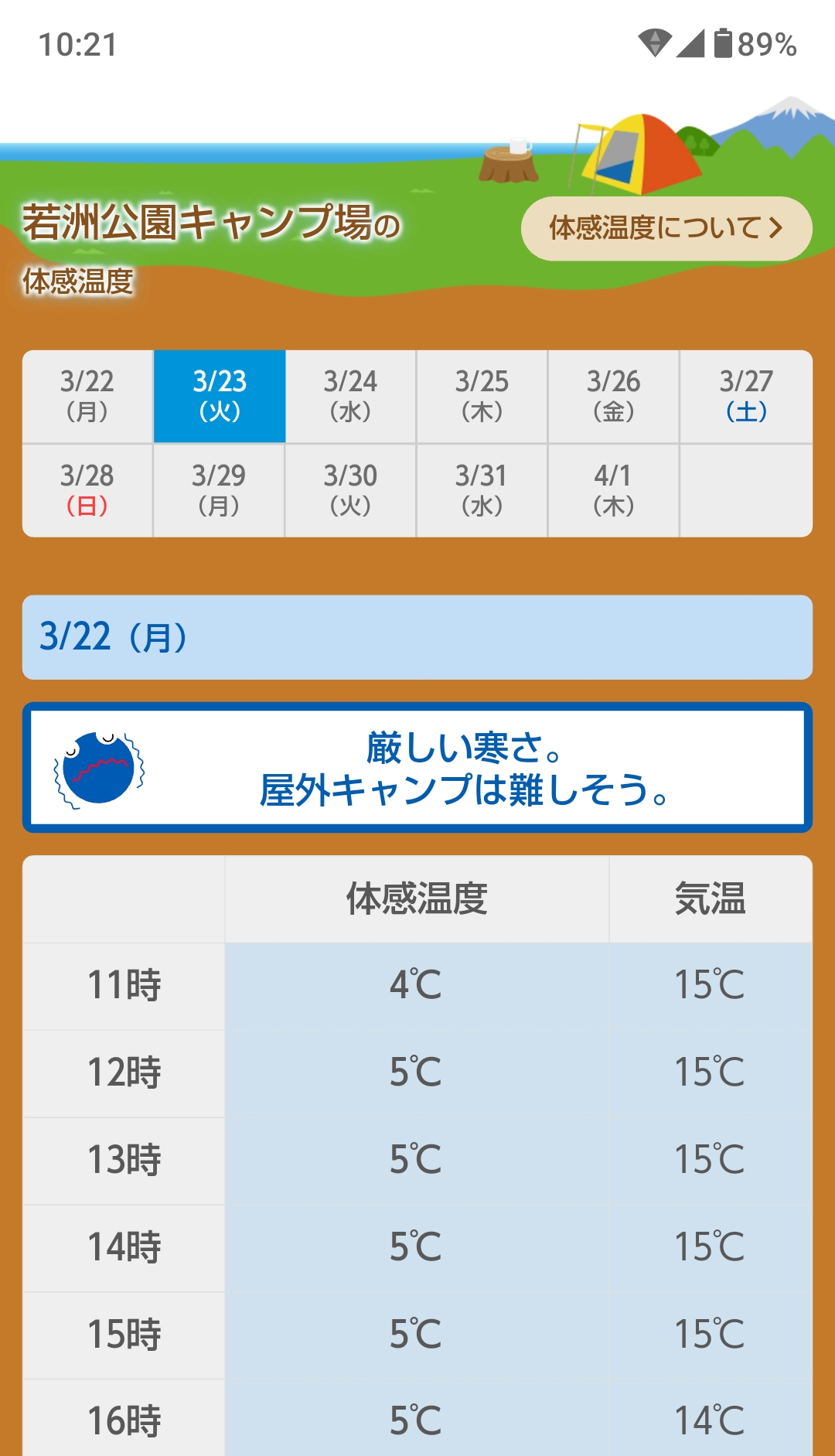 「体感温度」:気温と風の予報から各時間ごとの体感温度を算出しました。昼夜を問わず野外で活動するキャンプで役立てていただけます。