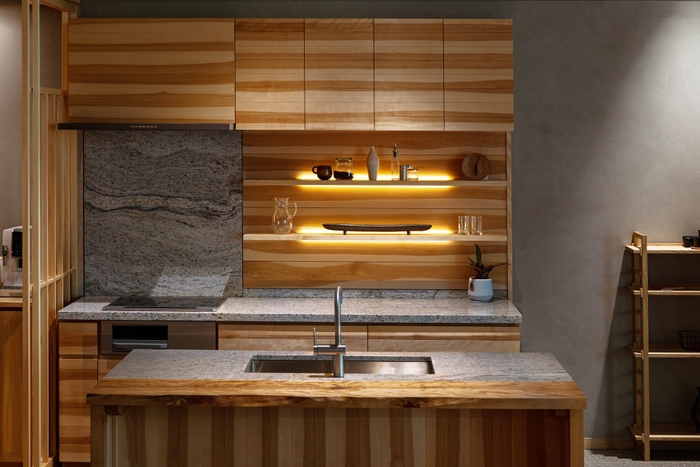 自社で設計したオリジナルモデルのキッチンセットを常設しています。素材には国産樺材や御影石などを用い、天然素材で統一しました。無垢材ならではの木目を表情豊かに配し、サイズは配膳や簡単なお食事まで可能な十分な奥行で、意匠・質感・利便性を兼ね備えた設計にしています。展示モデル以外にも、ご要望に合わせた特注タイプの設計まで、自社専門スタッフが承ります。