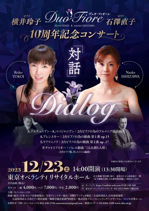 カノーロムージカ主催、『デュオ・フィオーレ10周年記念コンサート~対話、Dialog~』が2023年12月23日 (土)に東京オペラシティ リサイタルホール(東京都新宿区西新宿3-20-2)にて上演されます。チケットはカンフェティ(運営:ロングランプランニング株式会社、東京都新宿区、代表取締役:榑松 大剛)にて発売中です。