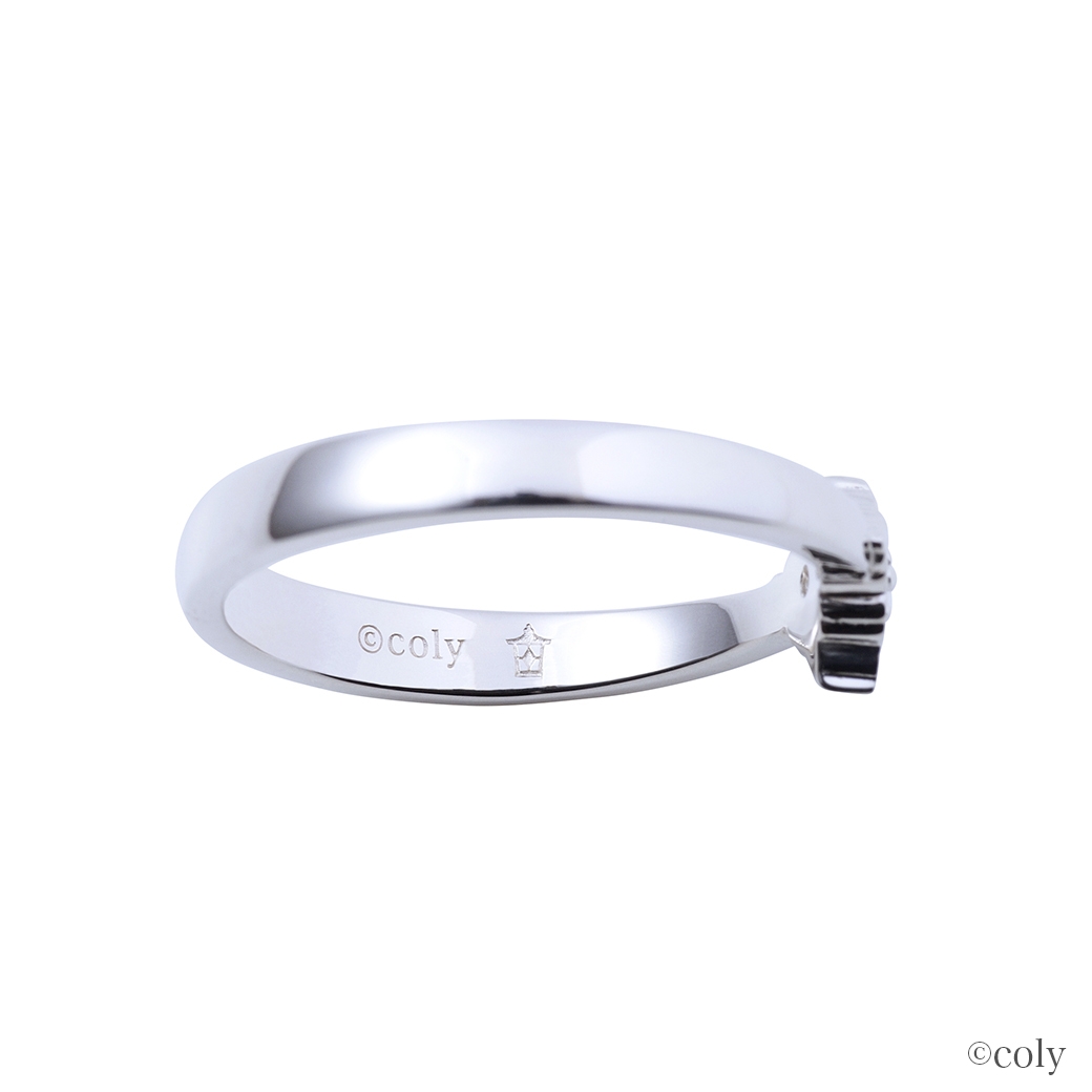 ブローチをモチーフとしてリングに取り込んだV字タイプのデザインに、イメージカラーストーンをセット。内側には魔道具のアイコンを刻印しました。スカーフをイメージしたラインがスタイリッシュなデザインです。
