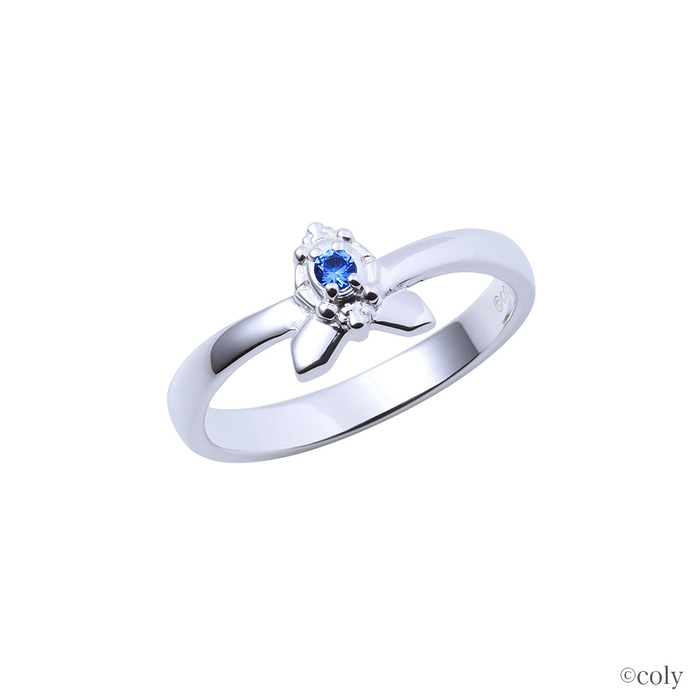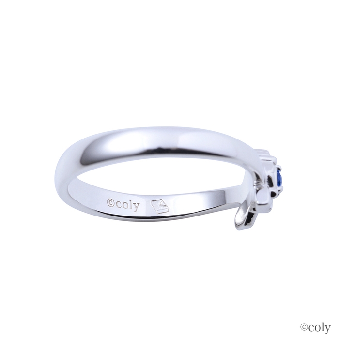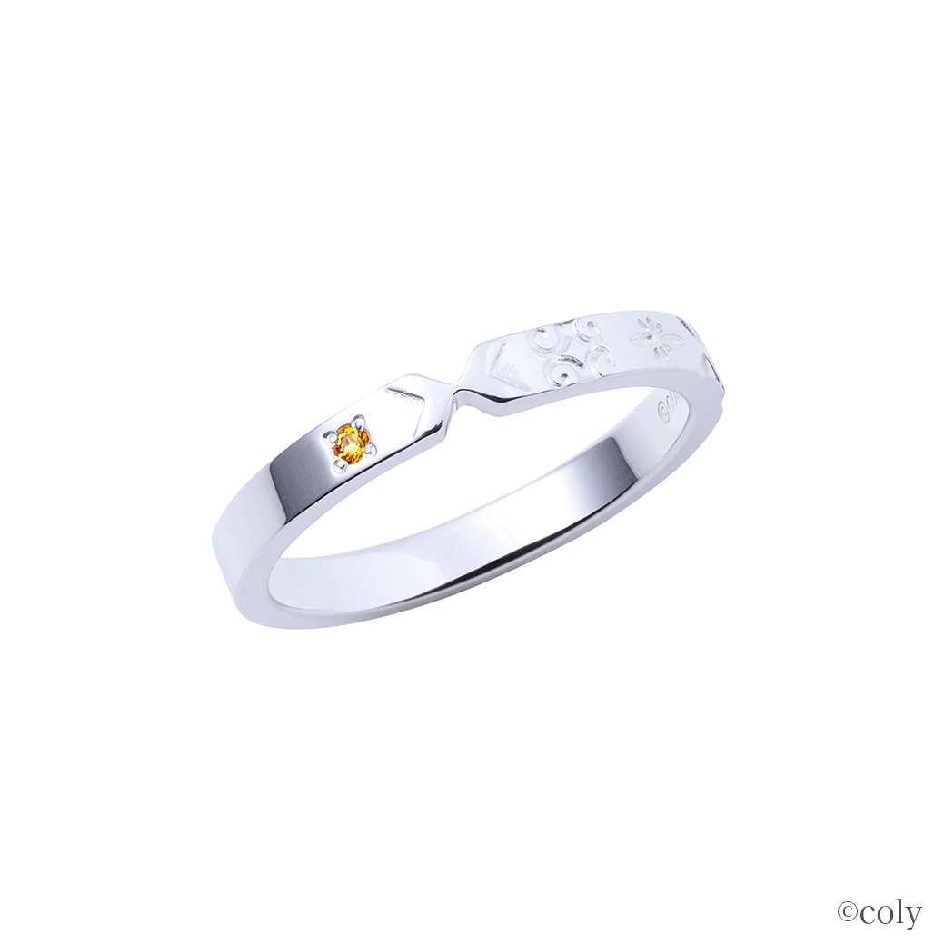 スカーフ留めをモチーフとしてリングに取り込んだストレートタイプのデザインに、イメージカラーストーンをセット。内側には魔道具のアイコンを刻印しました。繊細に表現したブローチが魅力的なデザインです。