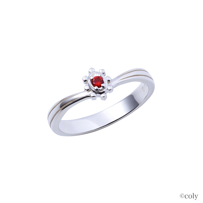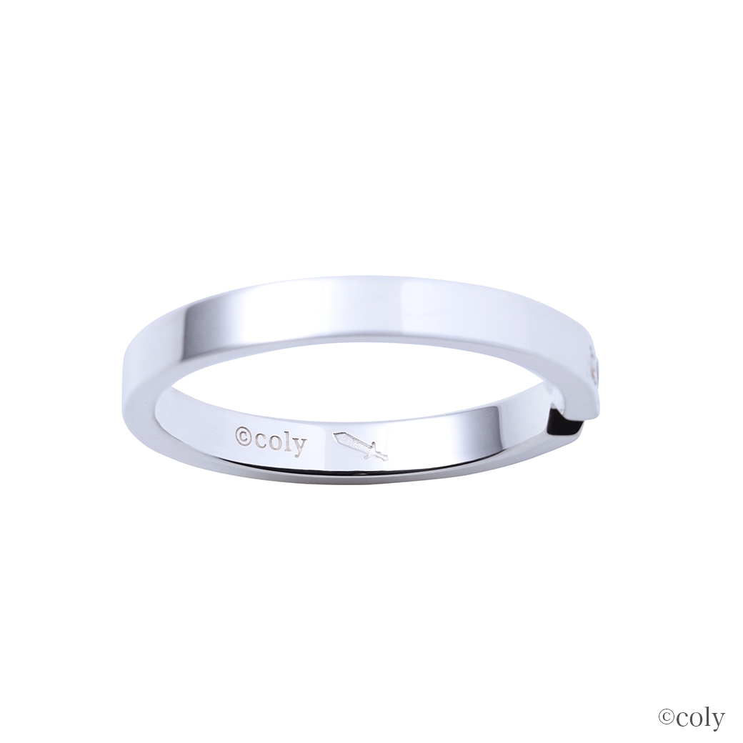 剣の模様をリングに取り込んだ平打ちタイプのデザインに、イメージカラーストーンをセット。内側には魔道具のアイコンを刻印しました。シンプルなストレートリングなので、普段使いしやすいデザインです。