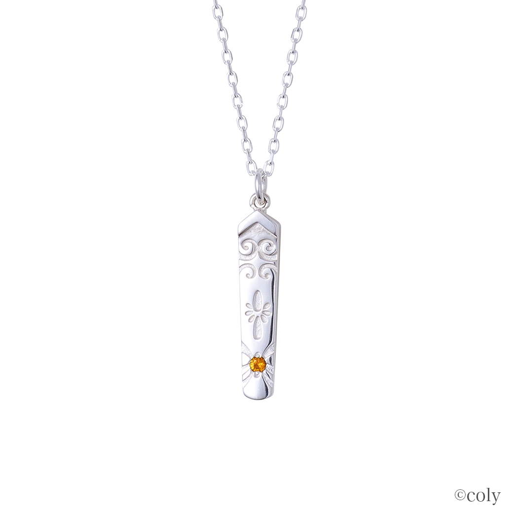 剣の模様をモチーフとして取り込んだトップに、イメージカラーストーンをセット。エンドチャームのプレートには名前を刻印しました。