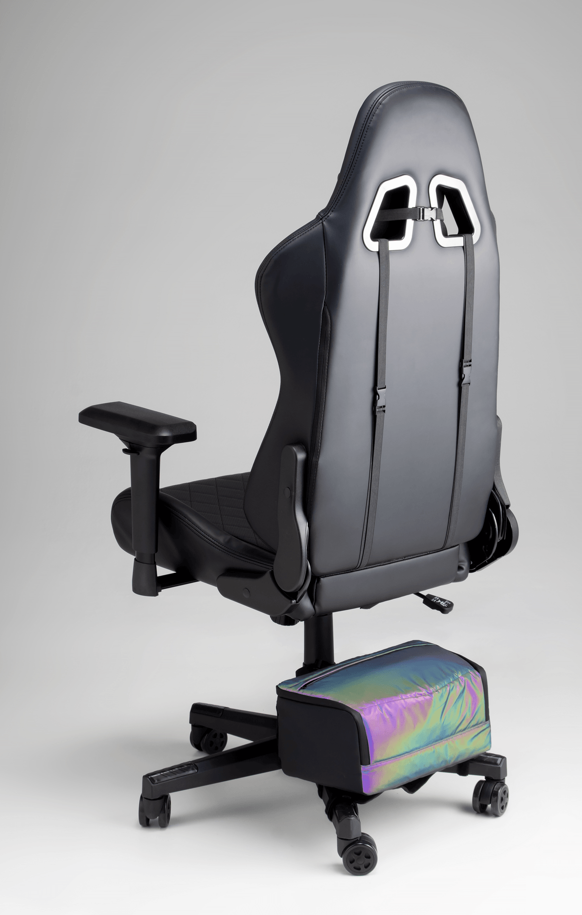 ゲーミングチェアの脚部(座面下)のデッドスペースを活用し、バッグは足元にすっきり収まります。収納が限られるワンルームや集合住宅、タワーマンションなどでもスペースを無駄なく活用できます。キャスター付きチェアなら掃除時もチェアごと移動でき、日常の動線を妨げません。