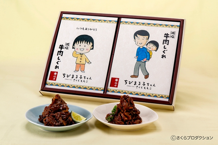 「ヒロシ&まる子 減塩 牛肉しぐれ詰合せ」のパッケージには、まる子とヒロシのイラストを使用しています。パッケージのひとつは、少し照れ顔を浮かべるまる子に〝いつもありがとう〟のメッセージを添えたデザイン。もうひとつには、ヒロシがまる子をおんぶするイラストで、お父さんと幼少時の娘の懐かしい思い出が回想されるようなデザインになっています。「減塩 牛肉しぐれ」の単品商品は、愛くるしいまる子が描かれた華やかなピンクカラーのパッケージデザインです。どちらも数量限定での販売となるため、父の日をはじめ、お誕生日や手土産など大切な方への特別なプレゼントにもおすすめです。