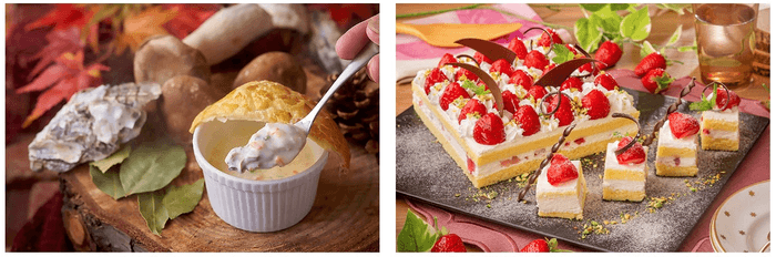 右:子供も大人もみんな大好きいちごをたっぷり使った「NYショートケーキ」。フレッシュいちごの他にも、ストロベリーリキュールやストロベリージャムなど、いちご尽くしの甘酸っぱい味わいが魅力の一品。