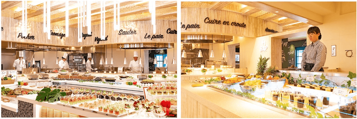 ライブキッチンの中で立ち働くシェフ、アイランド型のブッフェボードに出来立ての料理をきびきびと並べるサービススタッフが活気ある雰囲気を生み出す空間です。