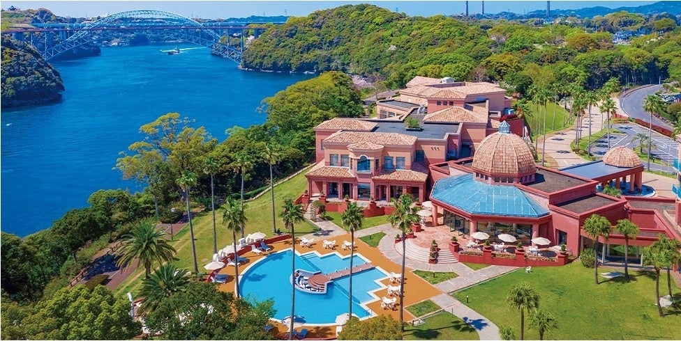 テラコッタカラーの建物、広々とした中庭、その中心のプールやフローティングラウンジ、そしてホテルを取り巻く西海橋の雄大な自然。