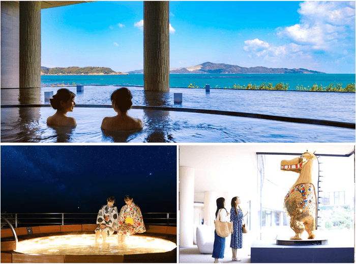 刻々と表情を変える鳥羽の海を眺める大浴場や、波の音に耳を傾けながら温泉を楽しむ露天風呂、足湯に浸かりながら海と星空を眺めることができる「星空テラス」など、開放的な空間や館内に常設している現代アートを観賞しながら語らいのひと時を大切にされるお客様が多い点が、これまでの大江戸温泉物語の宿の楽しみ方と異なる点です。