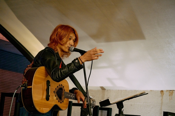 開演の19時少し前、ストリートライヴらしくフラッと姿を表した佐々木は、ハート型のサウンドホールも特徴的なZEMAITIS製AAS-3000HWを愛おしそうに抱き、まずは足元を確かめるように詩人の御徒町凧が佐々木をイメージして書き上げた歌詞に曲をつけた「歌うたいのブルース」をじっくりと響かせていく。観覧スペースを埋め尽くす観客がグッと惹きつけられる中、そのまま己の生き様を投影した「月夜の道を俺が行く」へ。会場は山手線の高架下、ステージとなっているスペースも側道に面しており、街の騒音も時折流れ込むが決してうるさくはない。佐々木の咆哮のような歌声とかき鳴らすギターと混じり合い、古着のような味わいがグッとくる。