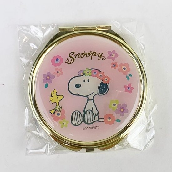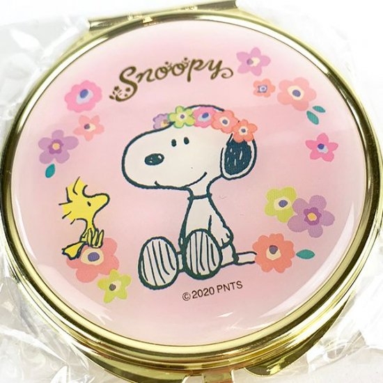 スヌーピーのお顔に花冠がかけられたデザインのコンパクトミラーです。淡いパープルの色合いとお花がマッチした、乙女心トキメクアイテム!お化粧直しの際にこのミラーをパカっと開けば、上手にお化粧が出来そうですね♡