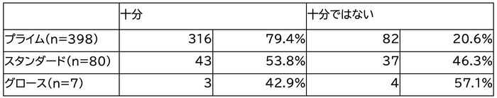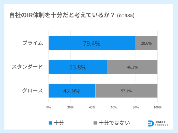 自社のIR体制について十分だと考えている割合は、プライム市場の上場企業だと79.4%の一方、スタンダード市場で53.8%、グロース市場で42.9%という結果となった。