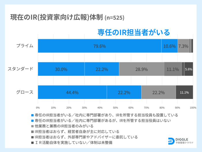 専任のIR担当者がいる割合は、プライム市場の上場企業では90.1%の一方、スタンダード市場では52.2%、グロース市場では66.7%という結果となった。