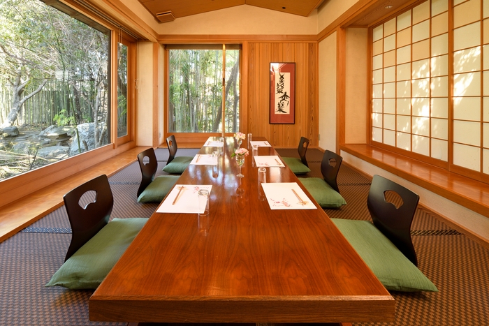 昼は柔らかな陽光が庭を照らし、夜はライトアップされた幻想的な風景が広がる。食事とともに、刻々と移りゆく日本の美を感じてください。