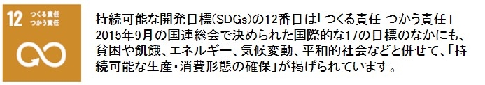 を行うこと。2015年9月に国連で採択された持続可能な開発目標(SDGs)の17のゴールのうち、特にゴール12に関連する取組です。