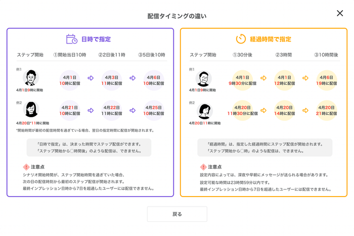 なお、メッセージを配信するタイミングは「ステップ開始直後」「日時」「経過時間」の3種類から選択できます。
