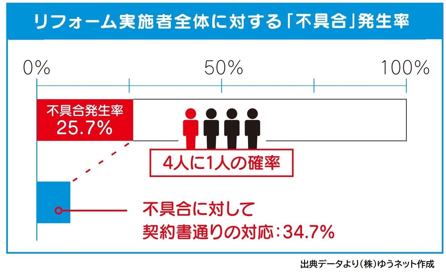一般財団法人リフォーム推進協議会が実施した消費者実態調査(※)によれば、住宅リフォーム工事において不具合が発生したのは、全体の「25.7%」、つまり『4人に1人』の確率です。