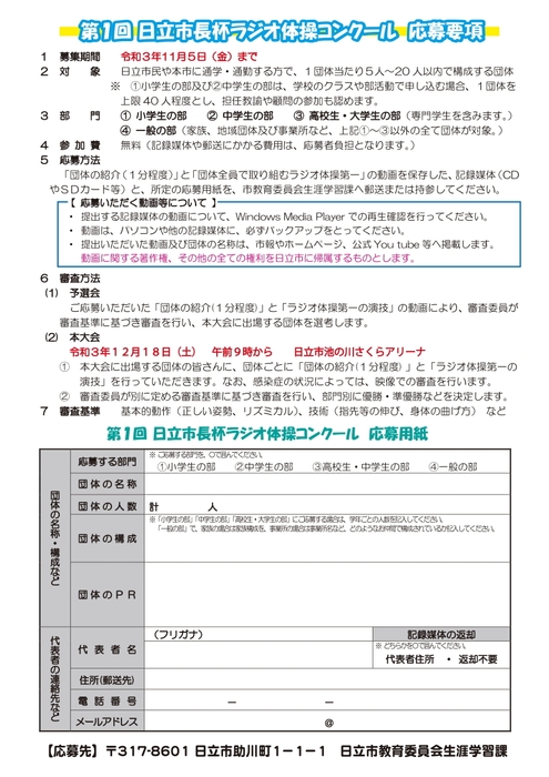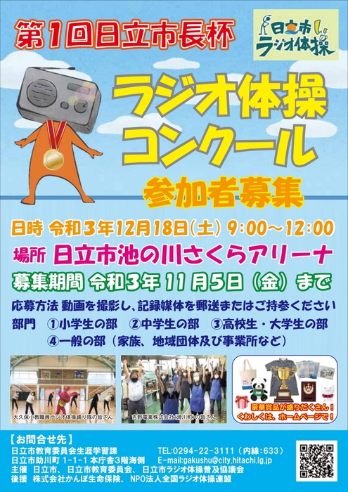 今年度、新たな取り組みとして、ラジオ体操の基本的動作や技術を競う「第1回日立市長杯ラジオ体操コンクール」を実施します!
