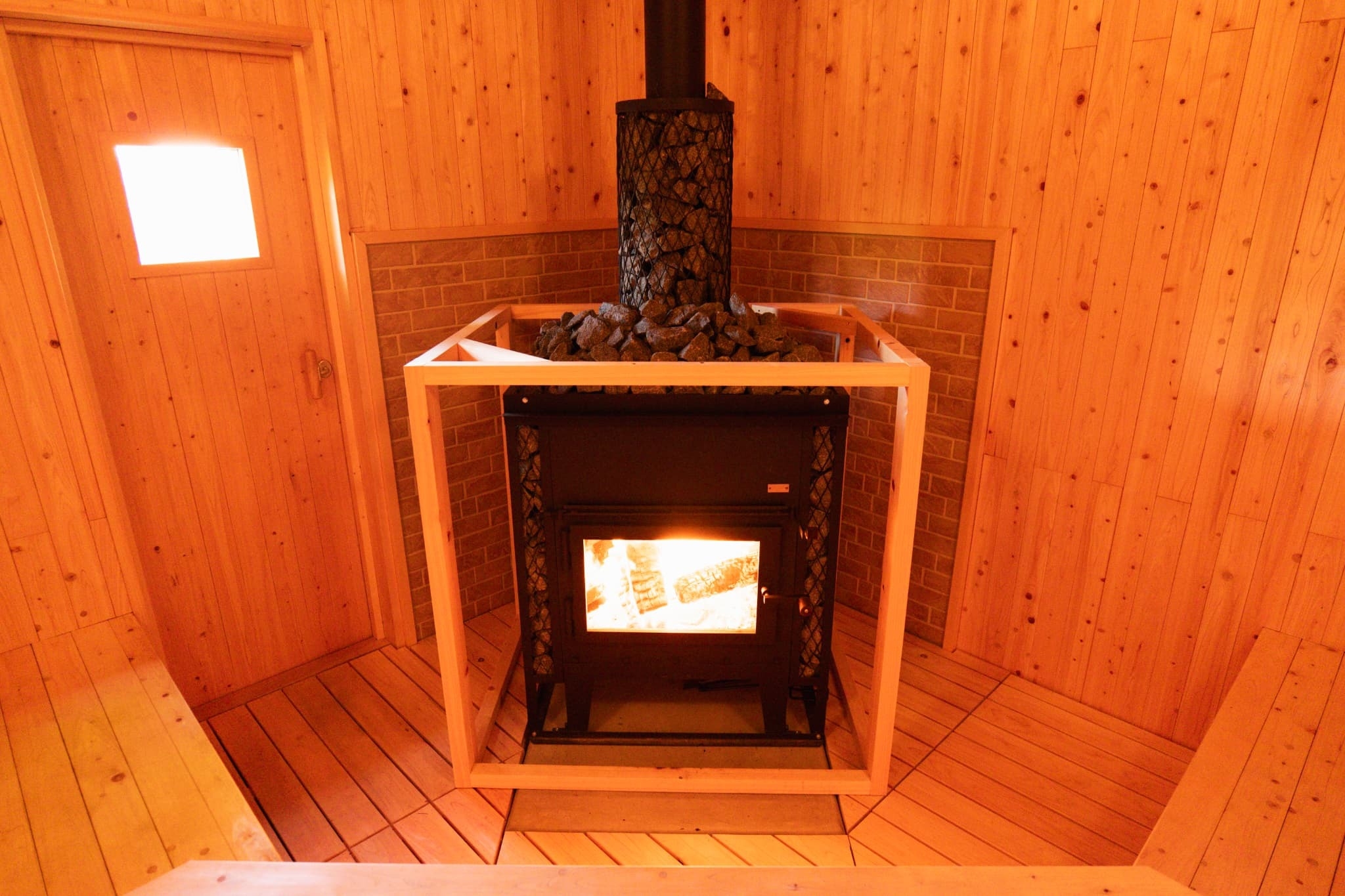 オーバースペックのサウナストーブには、高温が楽しめるだけでなく、サウナストーンを敷き詰めており自分でロウリュを楽しみながら蒸気と熱を楽しみつつ、大きなストーブの窓からゆったりと燃える薪と炎を見て非日常感の中でリラックスできる空間を用意しております。