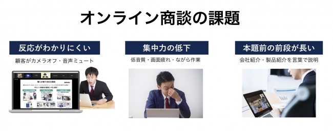またオンラインという気軽さから、遅刻や「ながら商談」をされてしまうことも多く、集中して説明を聞いてもらえない、という課題が成約率の低下を生んでいます。