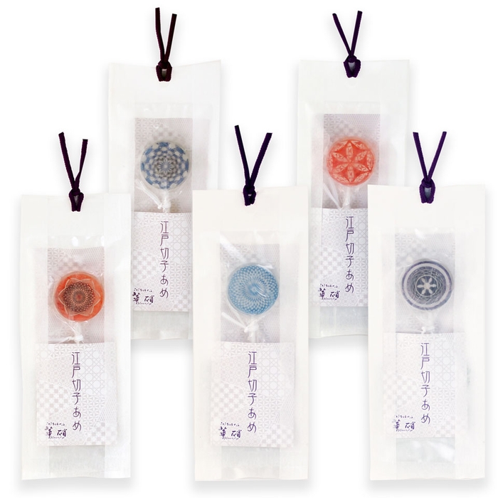 「江戸切子あめ」の絵柄は5種類。1946年創業の江戸切子の店「華硝」の文様「玉市松」「麻の葉」「米つなぎ」「矢来」「華盛」の文様から選ぶことができます。