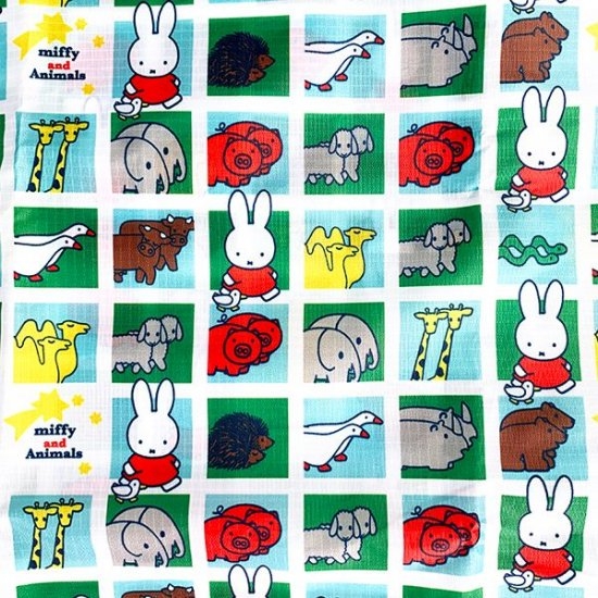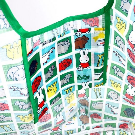 グリーンやレッド、イエローなどの原色遣いがカラフルでかわいい、ミッフィーのエコバッグです。お馴染みのミッフィーのほかに、絵本にも登場するゾウやキリン、ブタなどのアニマルズが大集合。縁取りのグリーンも効いていて、とっても楽し気なデザインです。