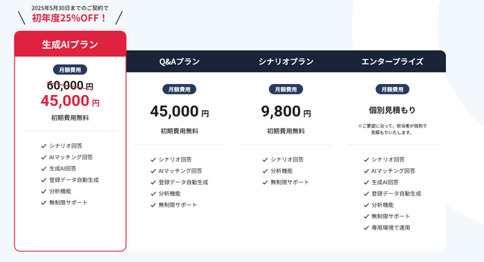 新プランでは最新の生成AI技術を活用し、より高度で柔軟な対話を実現。簡単操作と低価格で、貴社のユーザーサポートから顧客獲得までを支援します。