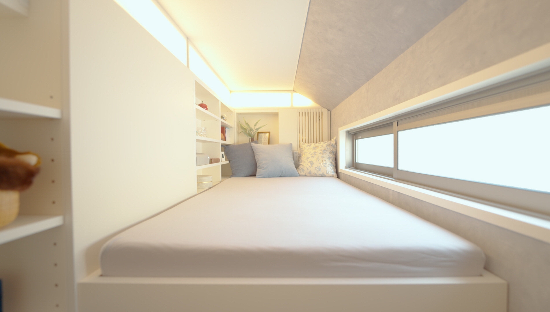 「間仕込」を設置すれば、一つの部屋に二つの子供部屋をつくることができます。下図は限られた空間を「上下」に使った一例です。外側から見ると勉強スペースと本棚となっていますが、内側には外側から見えていた勉強スペースの「上」の空間にベッドがあり、さらにベッドの手前側の「下」の空間にはクローゼットがあります。このように「間仕込」を使って、まるで秘密基地のような子供部屋をつくることもできます。