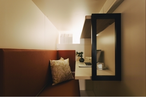 「間仕込」をリビングに置き、新たに籠れるスペースをつくりました。仕事や趣味など、使い方は人それぞれ。家族やペットの目を気にせずに没頭することができます。テレワークでのオンライン会議にも快適な空間をつくれます。
