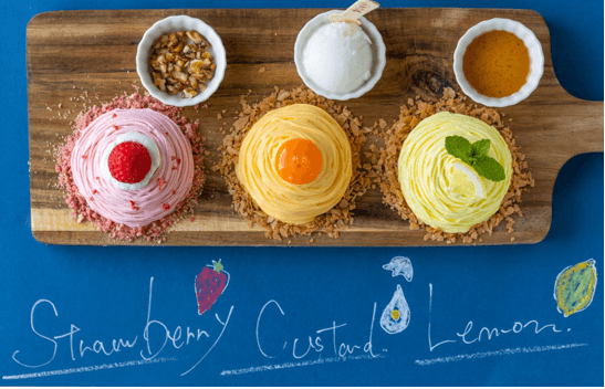 1番人気のカスタード、生いちごがトッピングされたいちご、季節限定のレモンと豪華な3つのパンケーキを食べ比べできます。さらに、カリカリ食感の香ばしいキャラメルクルミ、レモンソルベ、紅茶のシロップのトッピング付き。いろいろな味の変化もお楽しみください。