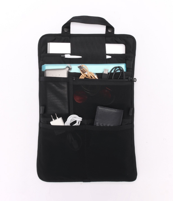 13.3インチまで収納対応のノートPCルームと、4つのポケットには各種ケーブル、バッテリー、ポケットWiFi、イヤホン等小物を美しく整理収納可能。