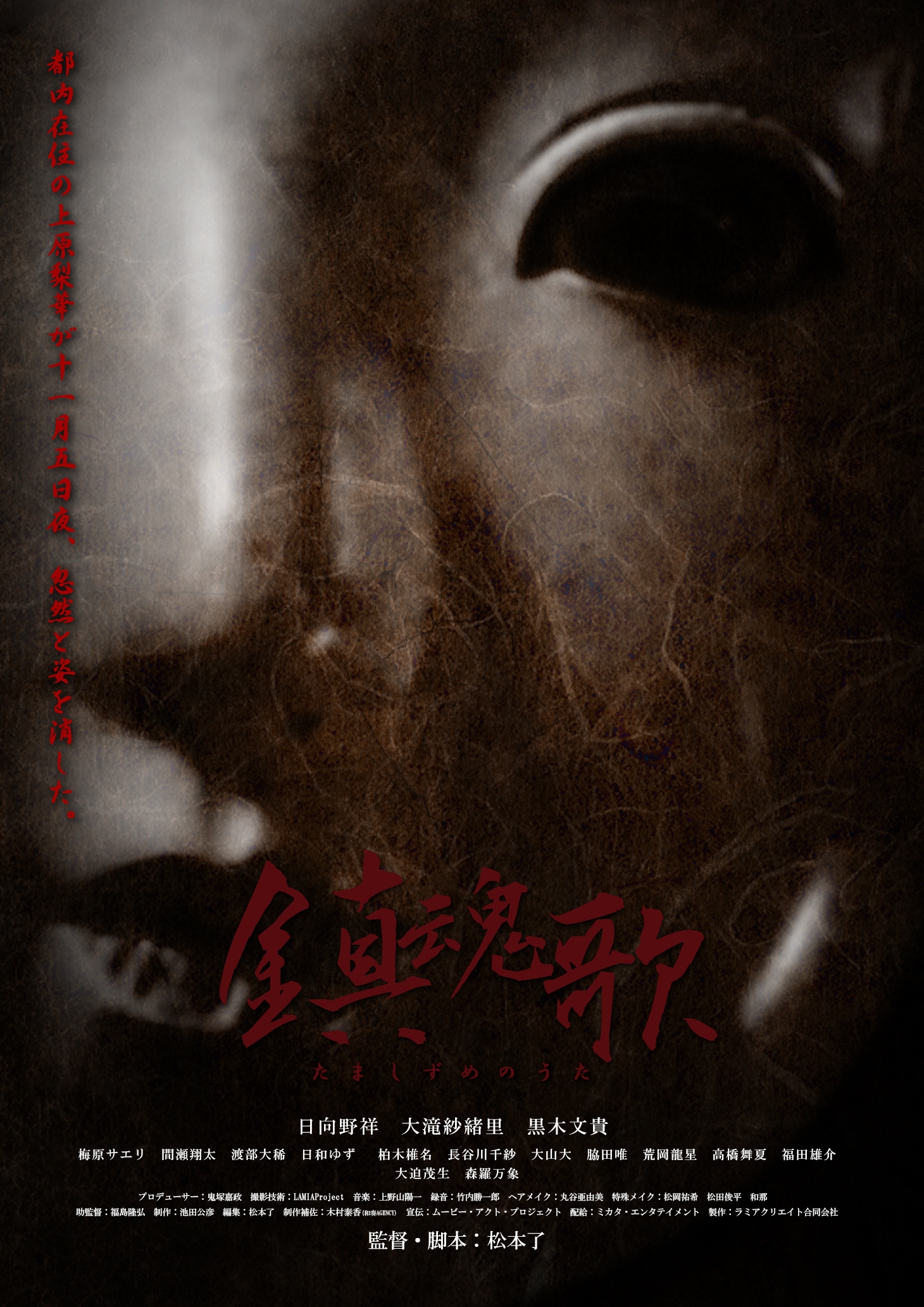 主にホラー作品製作・販売を手がけるラミアクリエイト合同会社(所在地:東京都調布市、代表:鬼塚嘉政)は、7月12日(金)に池袋HUMAXシネマズでロードショー公開が始まる、映画「鎮魂歌 ~たましずめのうた~」舞台挨拶が決定。日向野祥、大滝紗緒里、黒木文貴、梅原サエリ、松本了監督が登壇します。