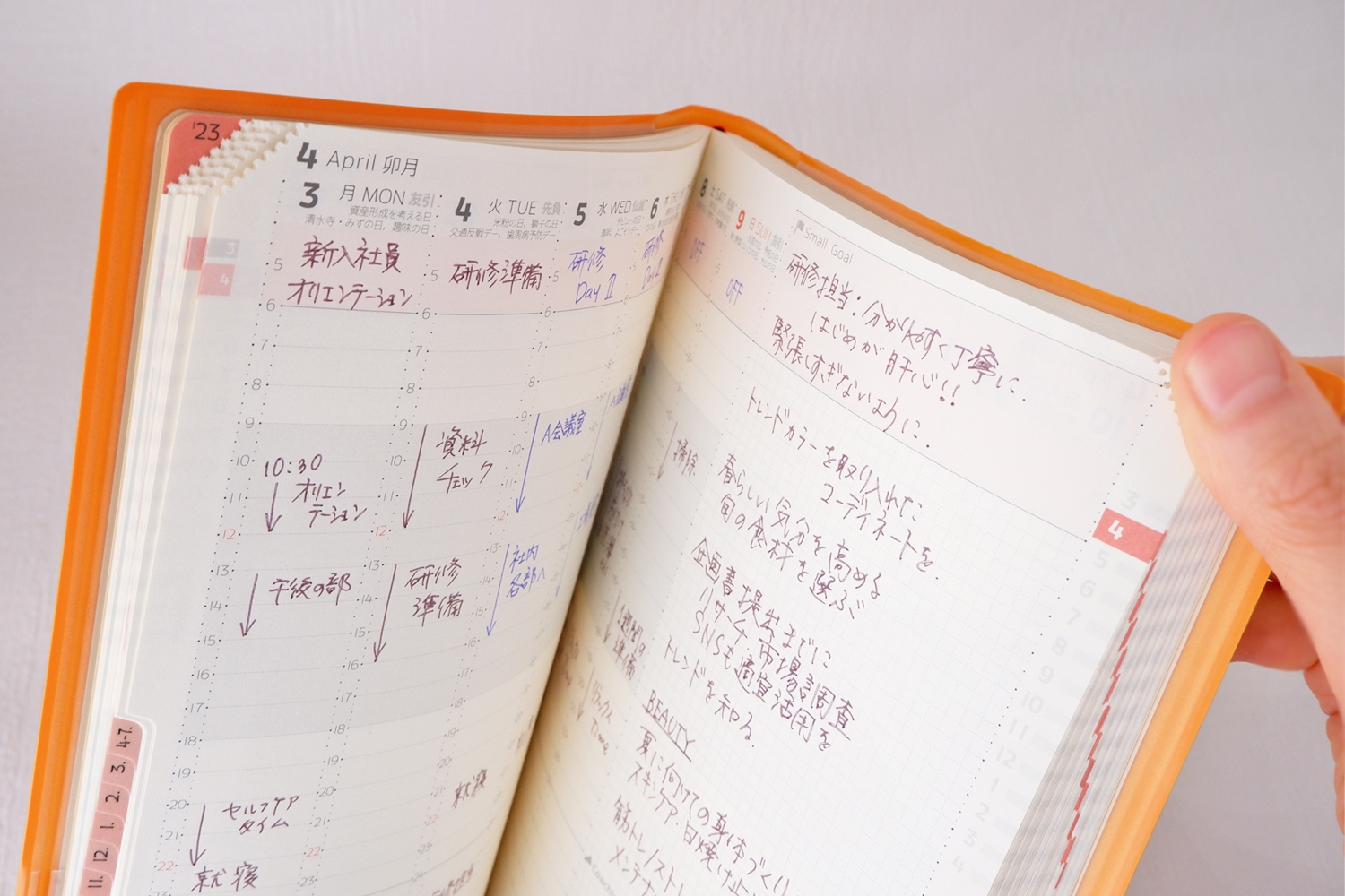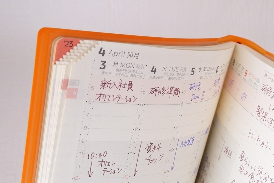 そのため、今週ページから月間カレンダーを開く際に、「今週ページにまた戻ることを想定して指や栞等を挟んだままの状態で月間カレンダーを確認しなければいけない」といった煩わしい動作は不要となり、何の躊躇もなく月間カレンダーを開ききることが可能となります。この「開ききることができる」といった安心感が、ページ移行の心理的負担を解消する機能デザインとなっている点に注目です。