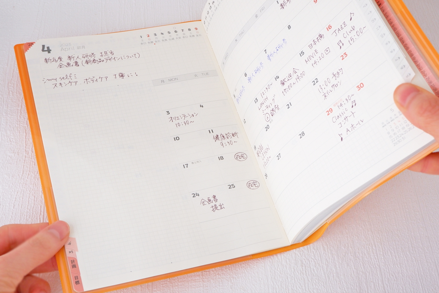 このように、「反転インデックス」と「コーナーミシン目」の掛け合わせで、今週ページと月間カレンダーを常にワンアクションで何度も行き来できる特殊な構造となっているのです。