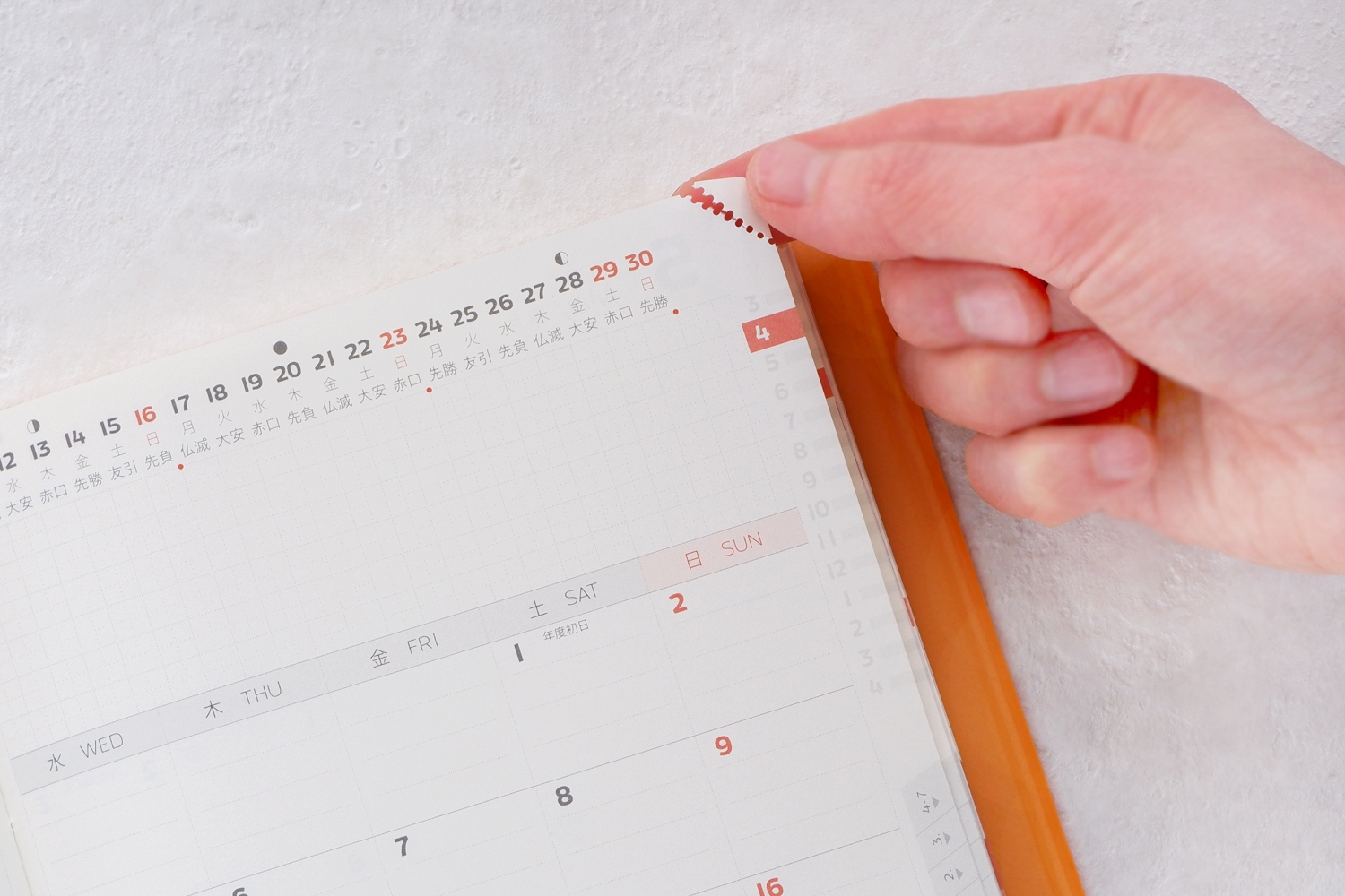 そして、この月間カレンダーを開いた後に今週ページへ戻りたいときは、右上の「コーナーミシン目」の箇所を押さえて開くことによって、同じくワンアクションで簡単に今週ページへ戻ることができます。