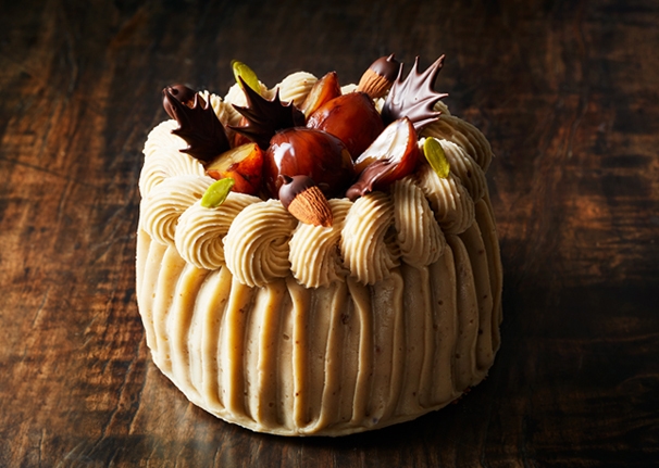しっとりふわふわなチョコレート味のスポンジケーキに、愛媛県産の和栗を使った栗の渋皮煮と生クリームをサンドし、創業当初から変わらない特製モンブランクリームを絞りました。仕上げに秋の森林をイメージをして、どんぐりに見立てたアーモンドや葉っぱに見立てたチョコレートを飾り、最後に栗を丸ごと贅沢に乗せました。コクのあるモンブランクリームと軽やかなスポンジケーキのバランスが心地よく、栗やアーモンドの食感が秋の味覚を感じさせる逸品です。