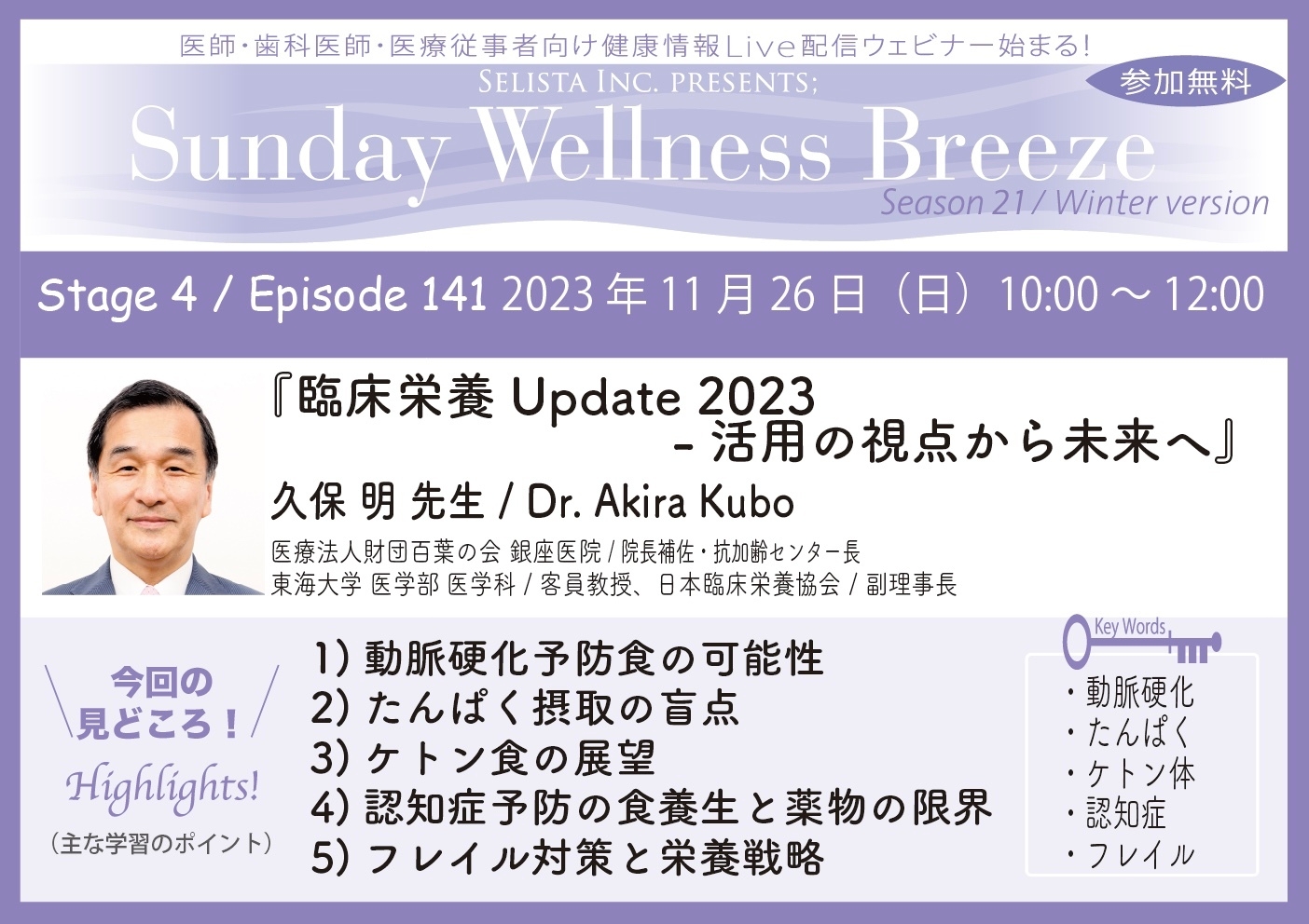 《医師・歯科医師・薬剤師向け》 無料オンラインセミナー11/26(日)朝10時開催  『臨床栄養Update2023 - 活用の視点から未来へ』 講師:久保明先生(医療法人財団百葉の会 銀座医院/ 院長補佐・抗加齢センター長、 東海大学 医学部 医学科/客員教授) | NEWSCAST