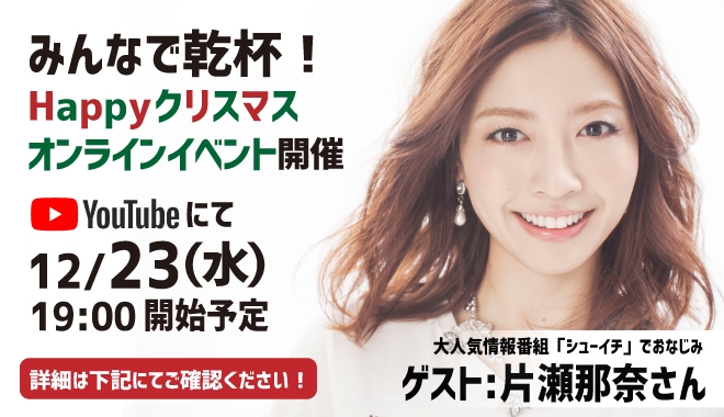 ゲストには、大人気情報番組「シューイチ」のメインキャスター、女優、モデルと幅広くご活躍されている片瀬那奈さんにご登場いただきます!クリスマスにぴったりのドリンクで、片瀬那奈さんと一緒に乾杯しましょう!