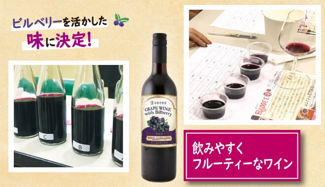 「ビルベリーの酸っぱさを際立たせたものがいいのか」「みんながおいしく飲めるように少し甘さを加えたものがいいのか・・・」、ビルベリーをたくさんの方に味わっていただくため、何度も試作を繰り返しました。試作を重ねた結果、色、味、香りが濃く酸味がまろやかで誰にでも飲みやすいフルーティーなワインができました。