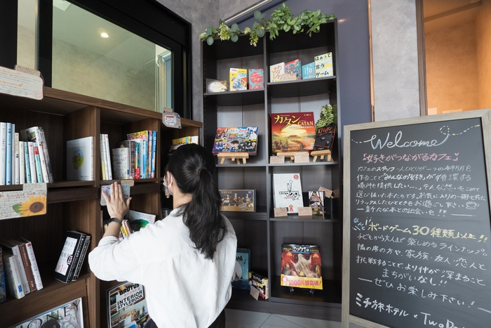 Two Dots Cafeのコンセプトとして掲げている、スタッフからお客様へ、好きなものから仕事へ、"様々なものを結びつけたい”という想いのもと、スタッフ厳選の本が並ぶ本棚と、みんなで楽しめるボードゲームコーナーを新設いたしました。