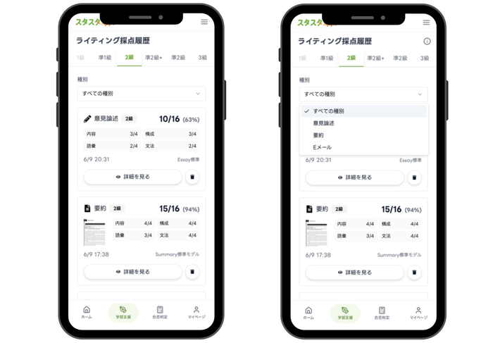 英検専門塾が作る英検®対策 Webアプリ「スタスタ Apps」( https://apps.studystudio.jp/ )は、ライティング AI 採点に自動保存されている過去 20 件の結果を一目で確認できる 履歴機能 を6月11日に正式リリースしました。