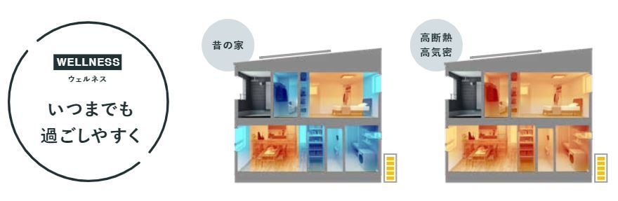もちろん『ZOOT』は、家族の健康と安心をしっかり考え、高気密高断熱を追求した規格住宅となっています。近年の研究で冬場の温かいリビングと寒い洗面・脱衣室など、住戸内の温度差が大きいと住まい手の健康に影響を及ぼすことがわかってきています。気密性能、断熱性能を高めることにより、家全体を一年中、快適な温度に保ち、住まいの寒さ・暑さによる健康リスクの軽減を実現しました。
