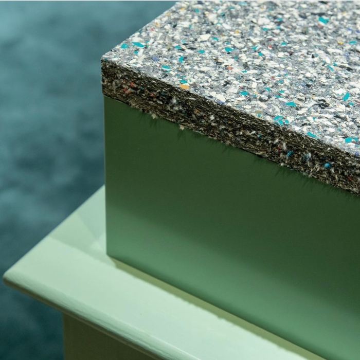 環境に配慮した店舗の什器などのデザイン・製作を手掛けるWORK STUDIO(ワークスタジオ)が、2021年に発売。日本国内で年間約120万トンが廃棄されている衣類に着目し、ファッションロスの削減と循環型社会をめざして開発された環境配慮型の繊維リサイクルボード。アパレルメーカー約100社から余剰在庫や製造過程で生じる繊維くずなどを調達してアップサイクルしており、原料の実に90%が衣料品。ボタンやファスナーなどを取り除いたあと粉砕し、接着剤で混ぜ合わせて熱でプレス加工して板状に成型する。そのため洋服の色や生地の表情がそのまま表れ、意匠的にもユニークなボードとなっている。1枚のPANECO®は洋服10~20着で完成。木材に匹敵する硬度があり、加工しやすいためさまざまな目的に使用することができるうえに、使い終わった後は回収し、再びボードとしてリサイクルできるのも魅力。