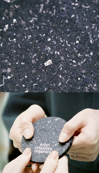 廃棄されるはずの衣類を原料とするサスティナブルリサイクルボード「PANECO®」とjohn masters organicsとのコラボレーションは、昨年、表参道にオープンした青山店の内装の一部にPANECO®を使用したことに始まる。