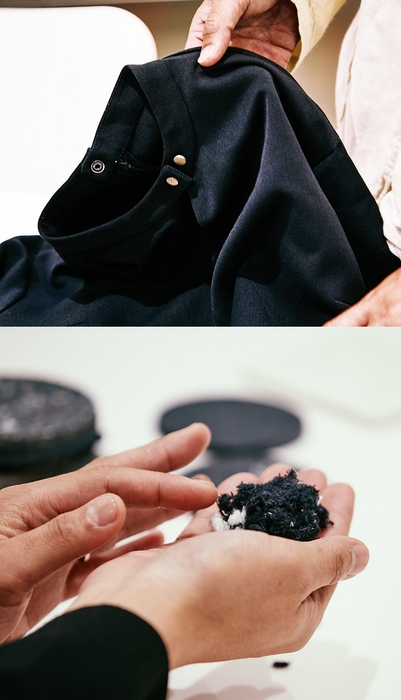 「PANECO®は、サスティナブルなことに加えて品質のよさもぜひ感じていただきたいのですが、さらにすごいのは実に多くの人の協力によってつくられていて、製造工程にストーリーがあるということなんです。ユニフォームのボタンをひとつひとつ手作業ではずして、今回のように紺色と他の色の配合を考えながら混ぜていく。1枚1枚に想いがこもっているので、ファンになってくれる人は深く共感してくれる。それがPANECO®の魅力だと思っています。さらに、PANECO®はファッションロスから生まれているので、おしゃれじゃないとダメなんです。そうでないと、john masters organicsのようなブランドに選んでもらえない。『おしゃれで素敵な素材だな』と思ったら、実は廃棄物からできていた、知らないうちに楽しくアップサイクルに取り組んでいた、という流れがベストだと思っています。今回、john masters organicsさんがすごいなと思ったのは、試作の段階で『制服の紺色だけでなく別の色も混ぜよう』という案が出たとき、普通なら『そちらで混ぜておいて』となるのに、なんと社員のみなさんが協力して自分の古着を持ち寄ってくれた。これは驚きだったし、作り手側としてはすごくうれしかったです。コストと時間を考えたら普通はそんなことしないのに、そうすることの価値をチーム全体が分かっている証拠ですよね」(草木)