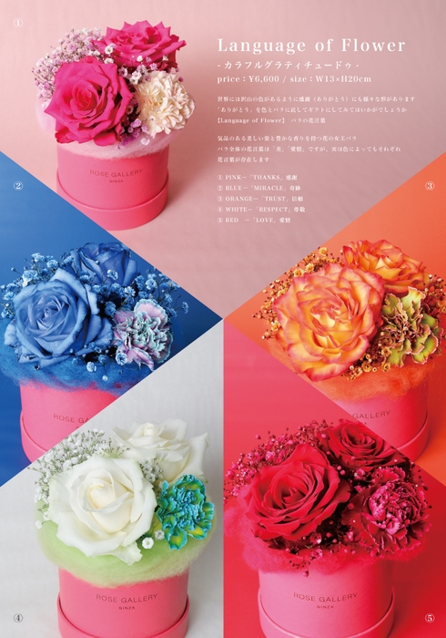 今回はバラの色花言葉にフォーカスして、5色展開の生花アレンジをご用意いたしました。