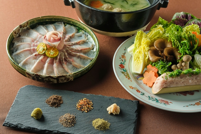 しゃぶしゃぶの出汁は、日本酒を使って蝶鮫の軟骨を煮込んでおり、コラーゲンと旨み成分(アミノ酸)を引き出すことで、とろみと甘みのある濃厚な味わいに仕立てています。蝶鮫の身を薄くそぎ切りにした切り身、軟骨が食感のアクセントとなるつみれに加え、きのこや山菜などを鍋の具材としています。また、雑炊へ仕立てることで日本の鍋の楽しみ方も紹介しながら、滋養豊富な出汁を余すことなく味わえます。